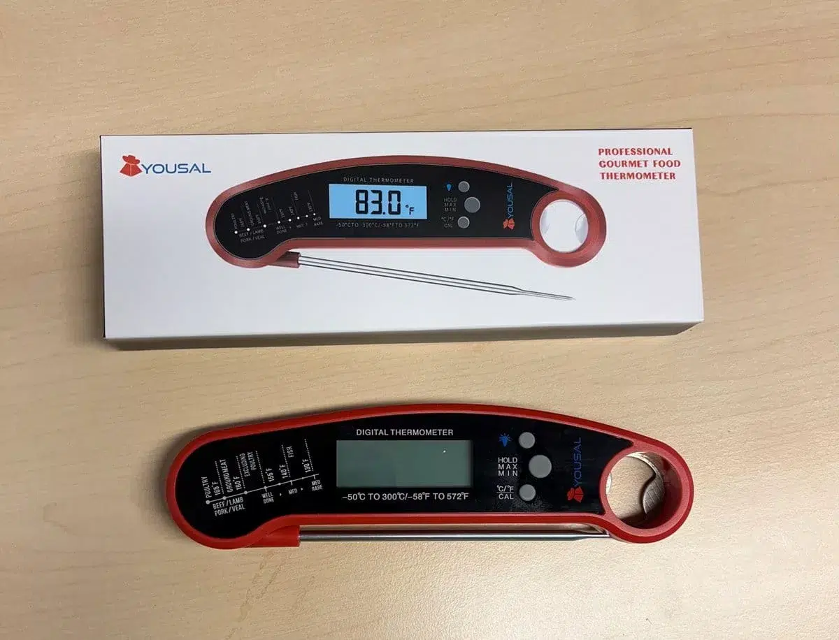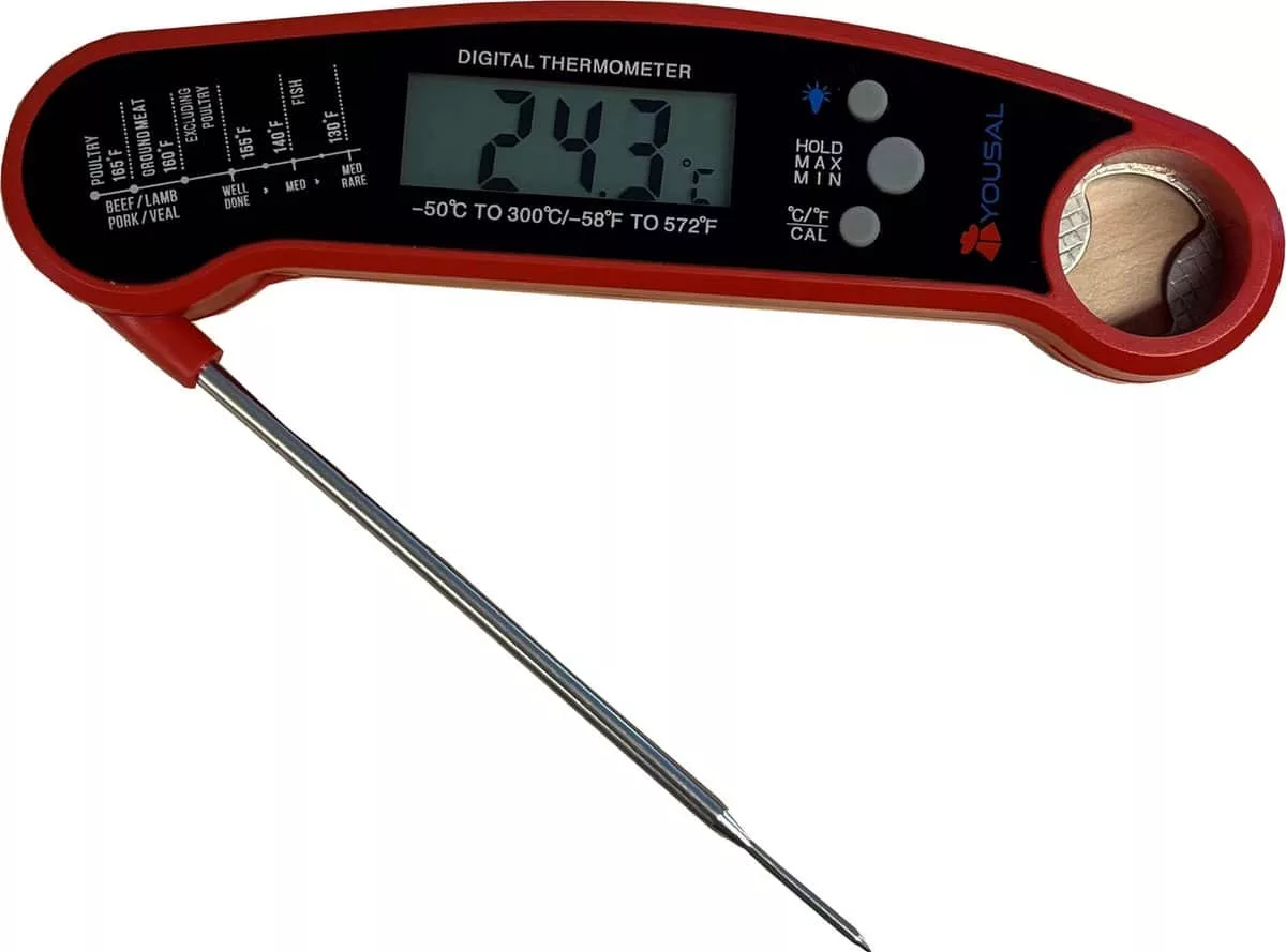 Instant Read Food Thermometer voor grillen en koken op de BBQ of gewoon in de keuken. Snelle en nauwkeurige digitale voedselthermometer met achtergrondverlichting, magneet, kalibratie en opvouwbare sonde voor keuken enbuiten grillen. Met flesopenerfunctie.